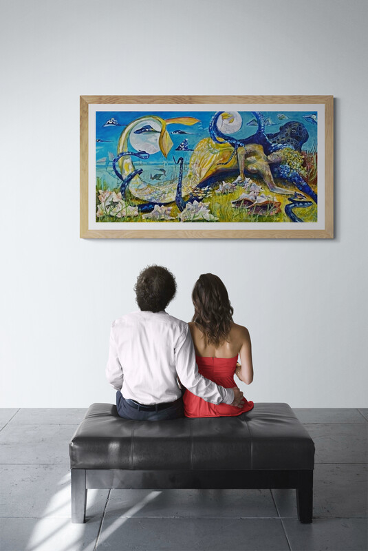 Once in a Blue Moon is one of those paintings where you feel, almost immediately, that a lot is happening — and that it’s happening on purpose. It’s submerged, mythic, slightly uncanny, drawing from real creatures and real relationships while allowing space for something imagined to exist among them.