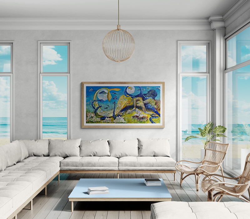 Color binds everything. Blues dominate without cooling the painting down, while golds and yellow-greens glow softly through shells, bodies, and water — closer to bioluminescence than light. Warm and cool coexist without struggle.